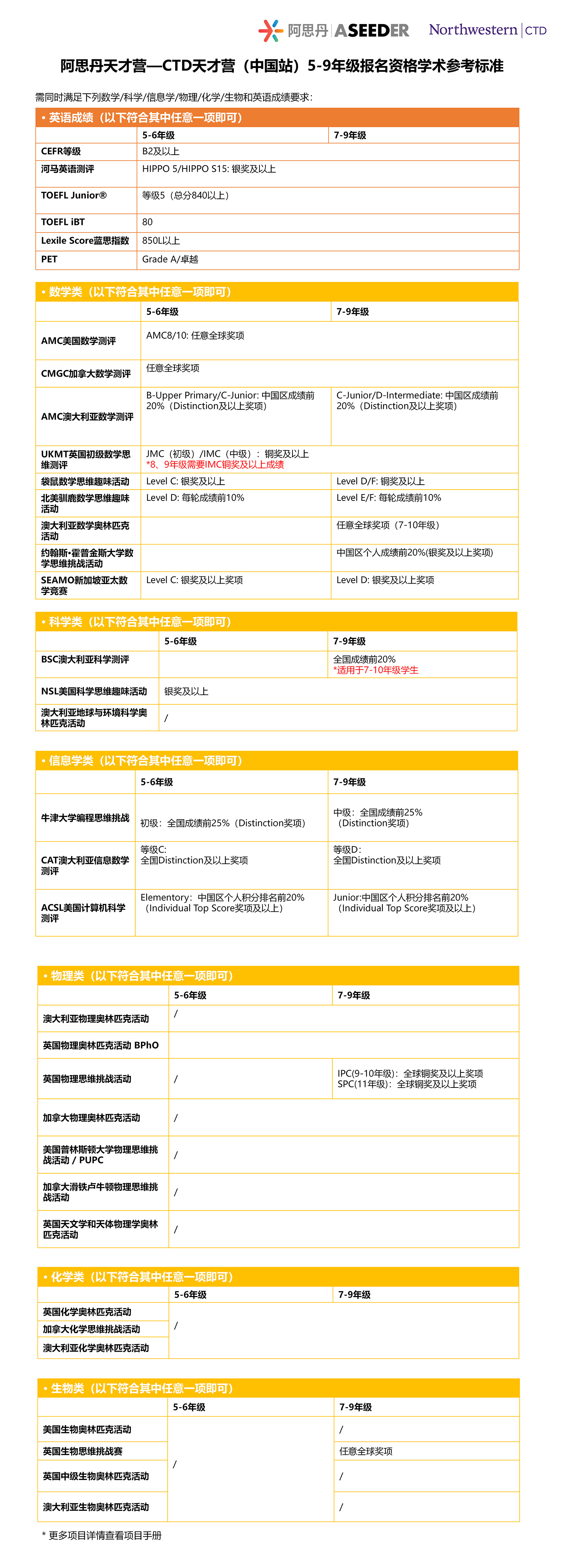 • 方式二:曾参加过阿思丹天才营系列CTD 天才营(中国站)、普渡天才营的学生可免测评直接录取;