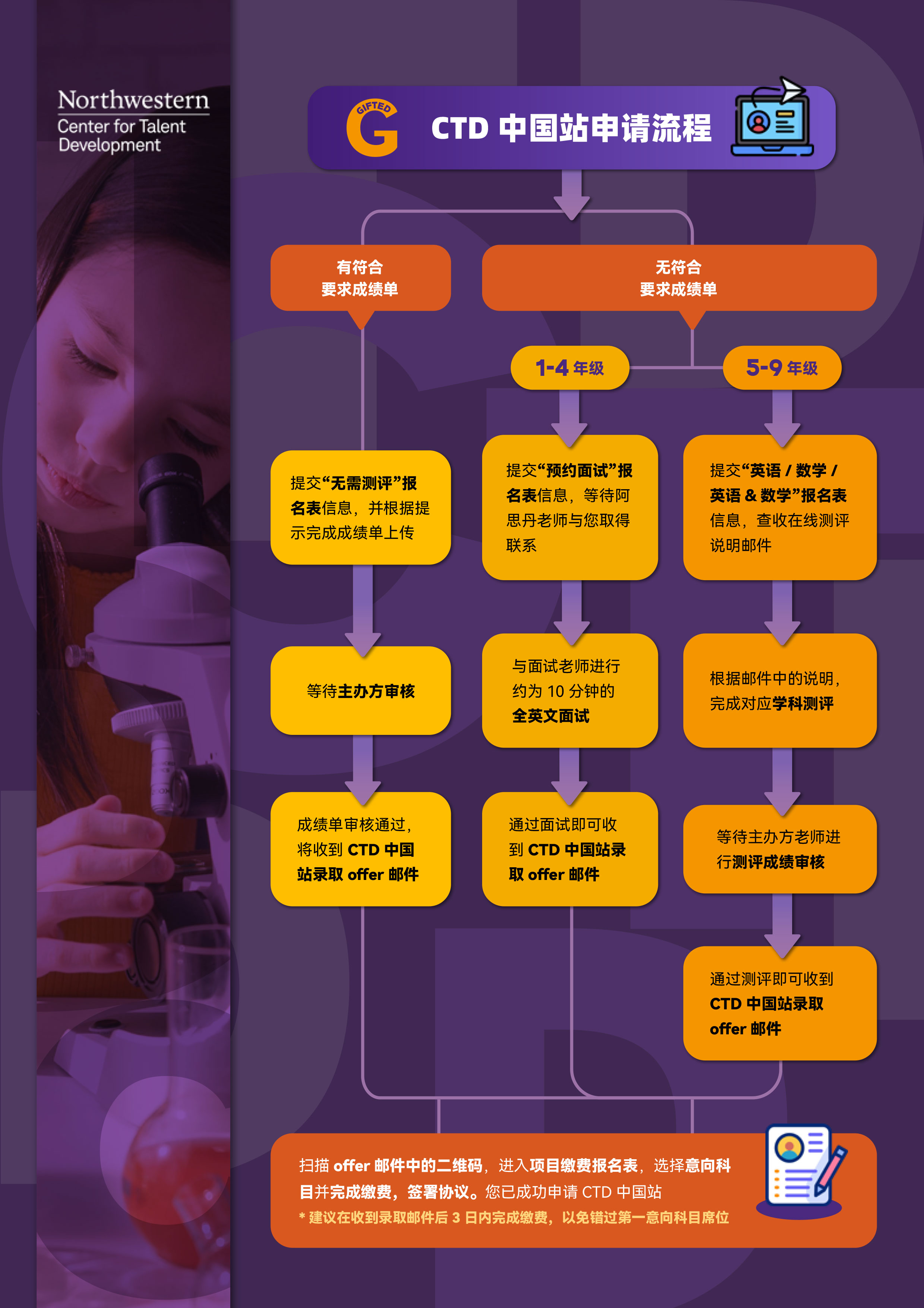 • 方式四:如果如没有上述测评成绩,1-4年级学生需参与阿思丹老师的在线英文面试;5-9年级学生需通过阿思丹组织的 CTD 中国站在线选拔测评(重点测评数学和英文能力)。