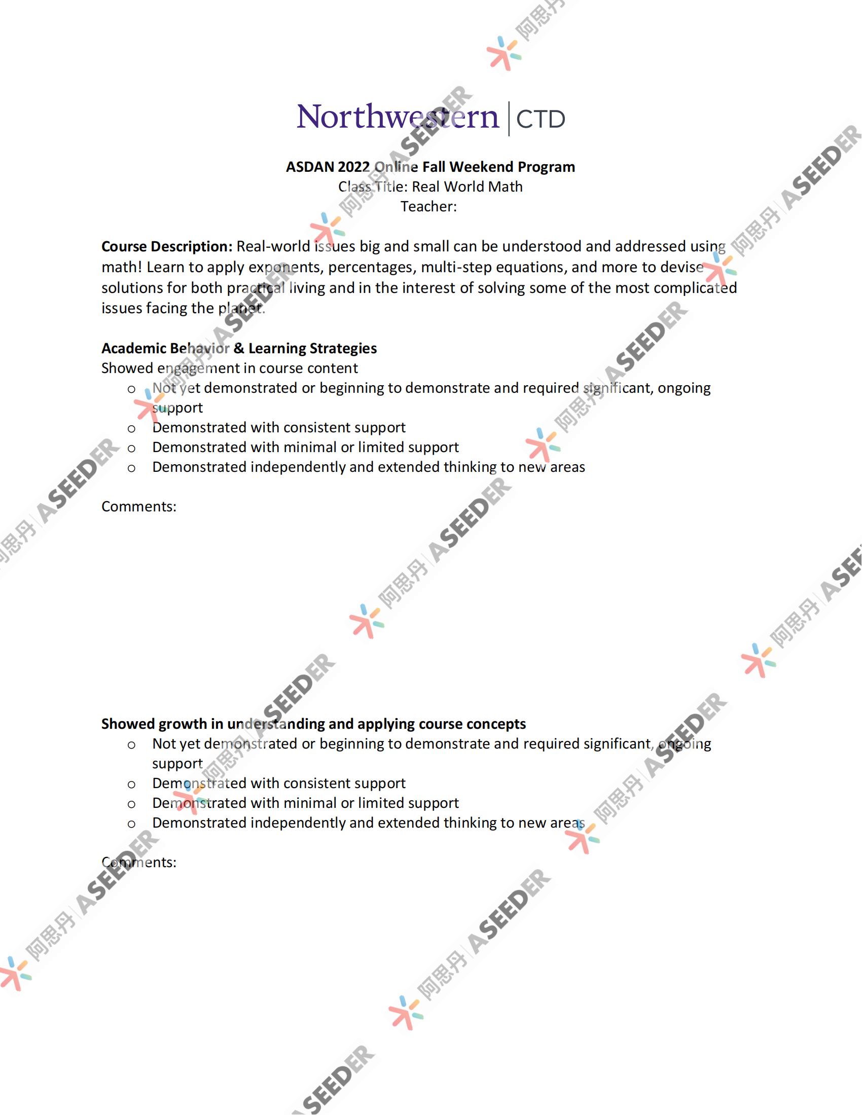 • 费用包含:CTD 西北大学少年天才营(中国站)项目课程内容费、导师学术辅导费、学术材料及道具费、教学场地使用费用、阿思丹全程带队老师服务费、项目期间保险费、 官方结业证书申请费、个性化评估报告费、双语助教费;
