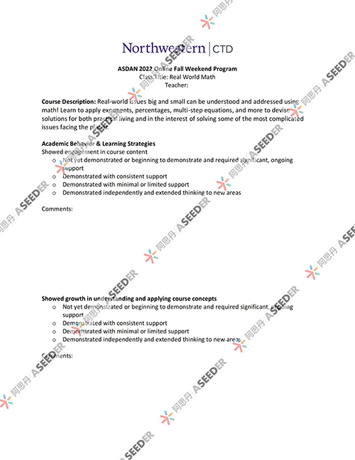 为了确保每一位入选的学生都能在纯英文的学术环境中获得最佳的学习与社交体验,美国西北大学CTD天才发展中心与阿思丹设定了明确的申请标准。 学生需满足以下标准中任意一项(*若学生选择非理工科类课题,只需满足英语成绩标准即可):- 方式一:提供双语/全英教学学校成绩单:英语、数学学科成绩为A或优秀等级的在校成绩单