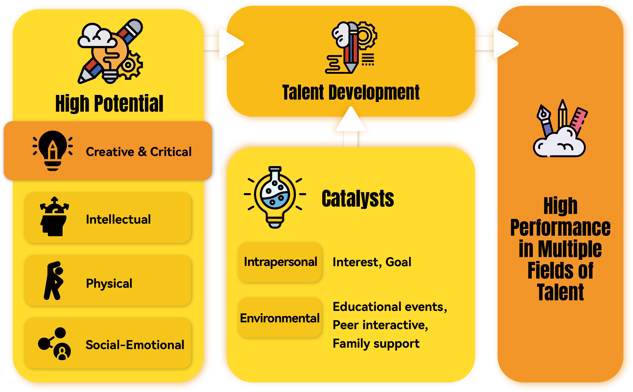 In the field of gifted education, we often ask: What defines a true genius? Internationally, one of the most recognized frameworks is the Differentiated Model of Giftedness and Talent (DMGT), developed by renowned Canadian psychologist and education professor François Gagné. His research shows that high IQ or strong academic performance is insufficient to define giftedness. Beyond these, critical thinking and creativity—two higher-order cognitive skills—interact with intellectual, physical, and social-emotional attributes to form the key dimensions of talent development. These abilities serve as core drivers in transforming innate potential into tangible achievement.