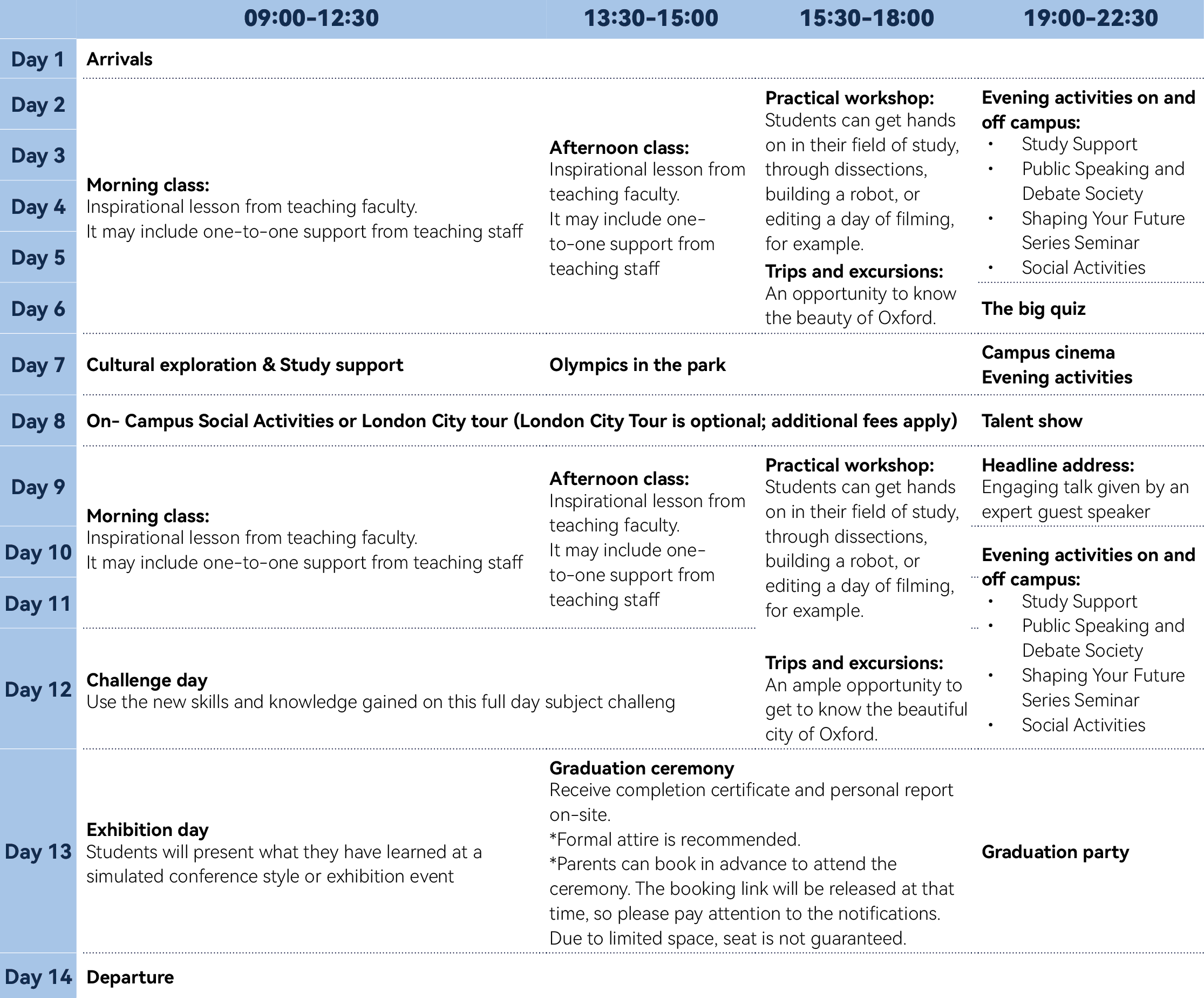 The schedule is provided as reference only and is subject to change by each college, which operates independently. We highly encourage all students to participate in the evening social activities.