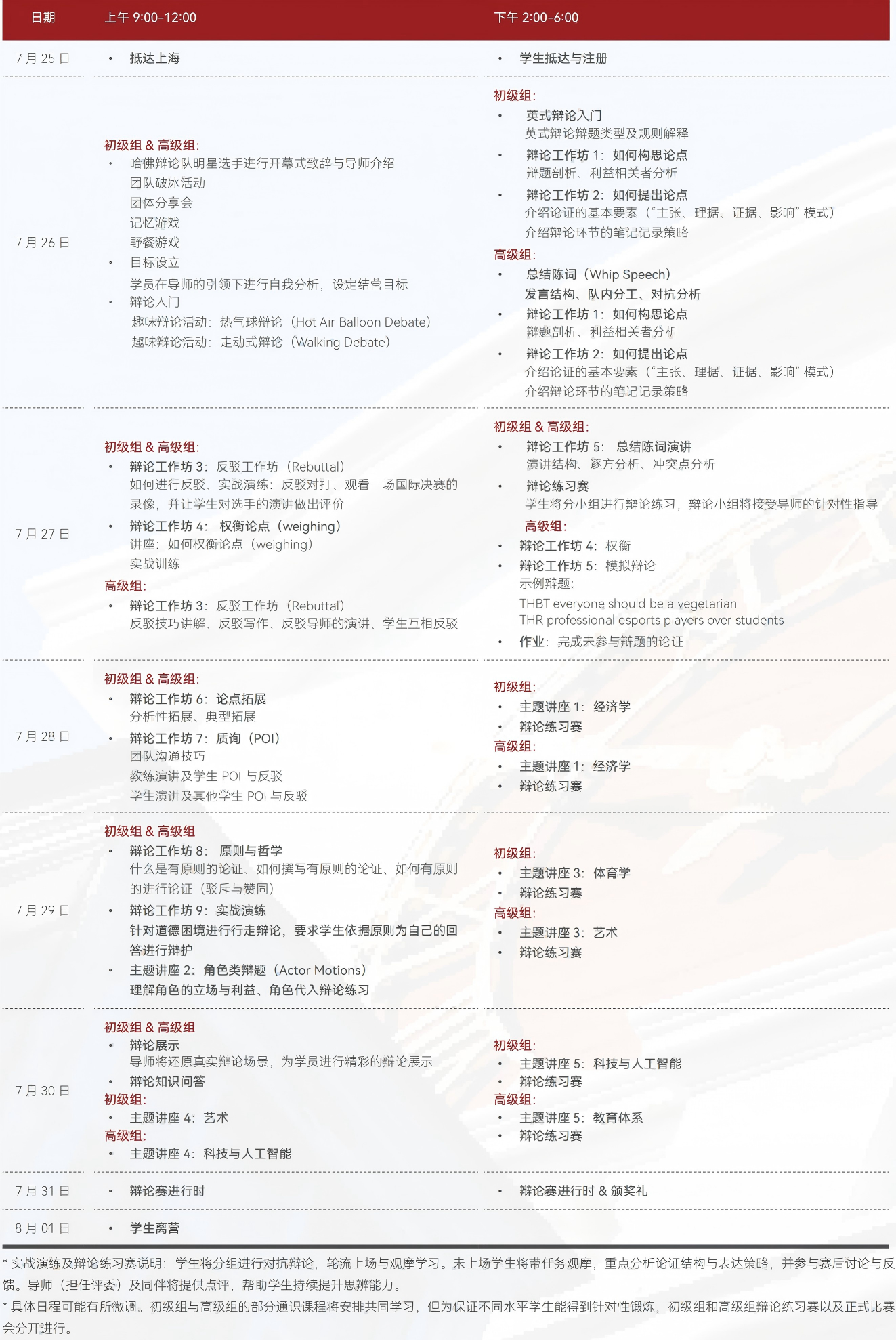 2023 年,哈佛辩论营首次落地中国上海,至今已有将近150名中学生通过选拔并参与项目,2026年暑期,哈佛辩论营再次面向全国优秀初高中生开展选拔,在哈佛辩论营,你将有机会现场体验哈佛顶尖辩手带来的精彩辩论展示,学习哈佛前沿辩论思维及技巧,与优秀辩手碰撞思维火花。营地将设置初级组及高级组,并进行分组授课,无论你是刚开始接触辩论的小白,还是辩论圈大佬,哈佛辩论营都能带给你全新的体验和丰富的收获,在这里,辩论爱好者们将通过辩论工作坊的分享,深度了解英式辩论(British Parliamentary Debate),学习来自哈佛的辩论技巧,并就所给议题开展辩论比赛,争夺哈佛辩论营的冠军荣誉。