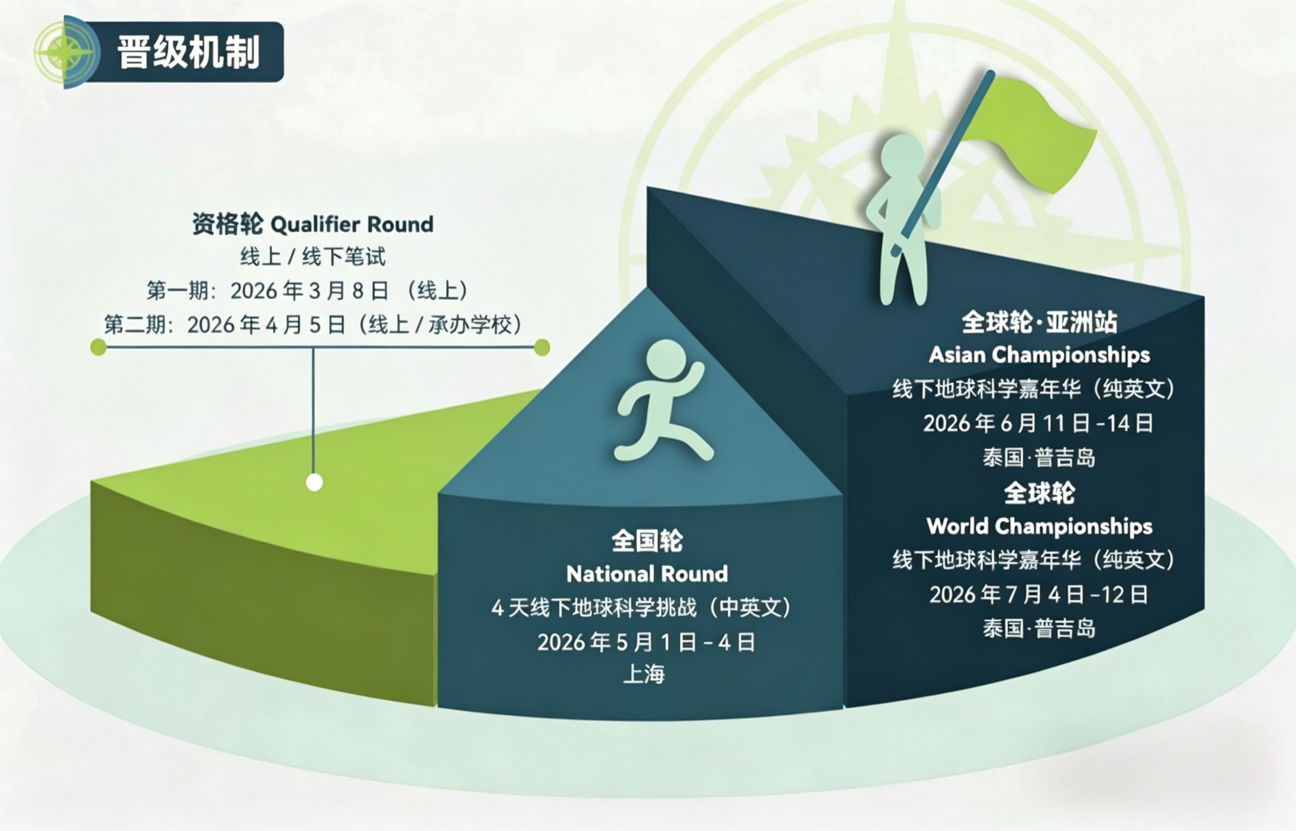 2025-2026 全国轮英文场次中获得晋级资格的优秀同学可报名参加全球轮·亚洲站。亚洲站每年举办一次,是同学们展示地球科学知识积累、结交来自全球的同好、收获荣誉与成长、走向世界的绝佳舞台。- 时间:2026 年 6 月11 日 -14 日