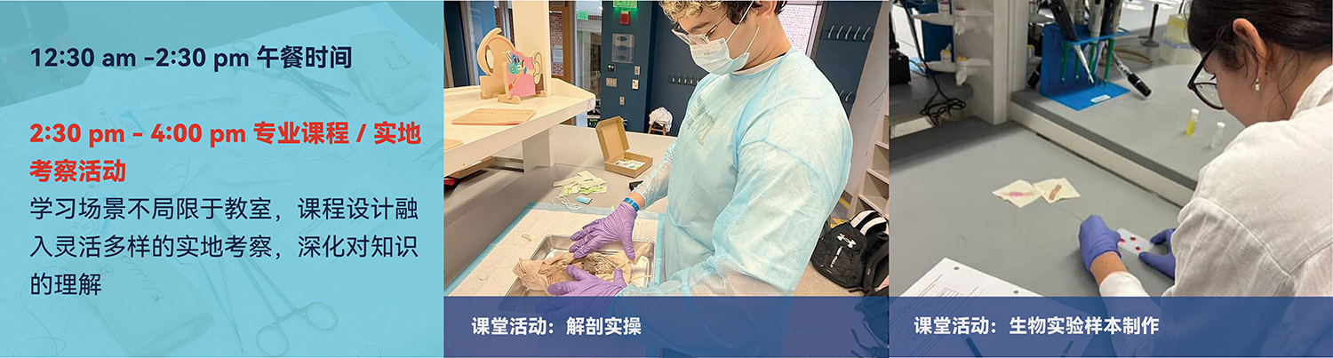 专业课程与实践操作两大课程模块,根据选择科目不同将进行不同主题的实践工作坊,如猪胎解剖、PCR 扩增DNA 片段、太空望远镜设计等,学生可以将理论知识应用于实际情境中,加深理解并提高解决问题的能力。