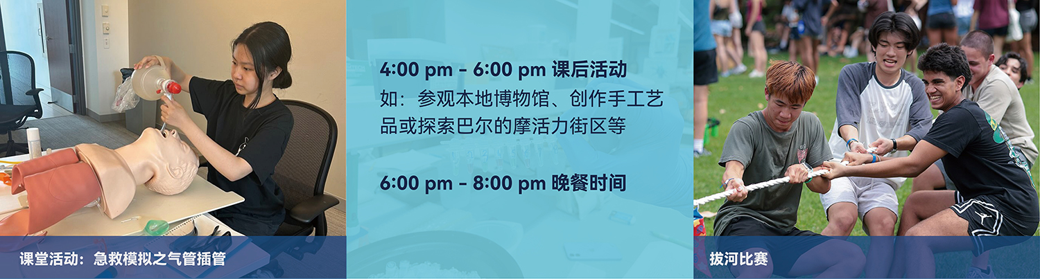 每日课后和周末同学将参与丰富多彩的课外活动,如客座嘉宾演讲,本科申请和校园生活分享工作坊,体育活动以及周末远足,发现自己的潜能和兴趣,促进自我认知和个人成长。