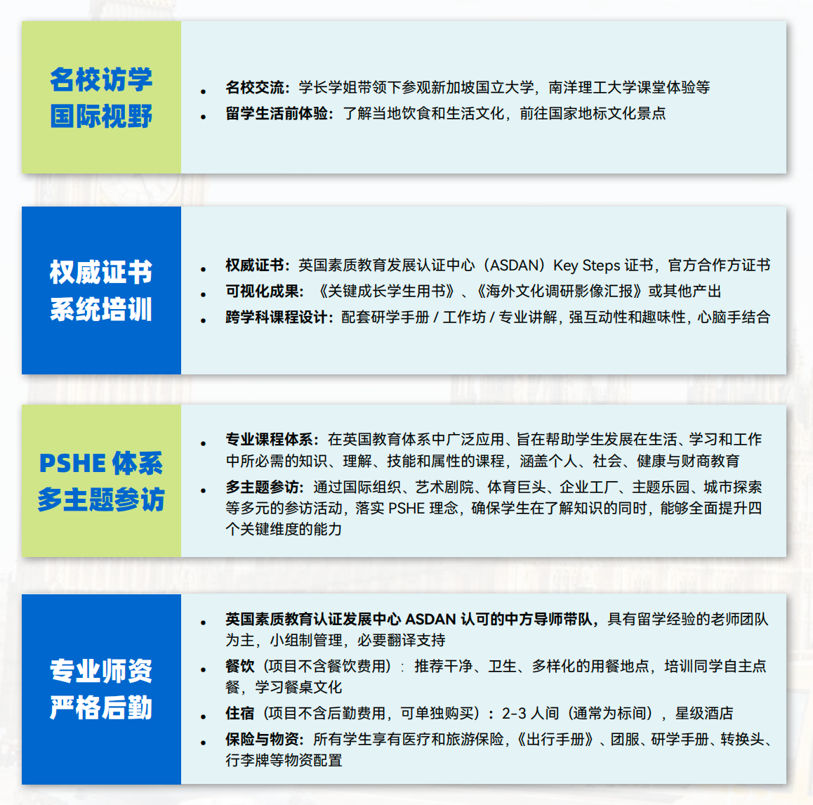 初中阶段是成长的“黄金时机”,初中 " 关键成长 " 国际研学(Key Steps)以英国教育部官方认证的 PSHE(个人、社会、健康与经济教育)必修课程体系为理论框架,与全球知名教育机构深度合作,如全球知名口语测评英国圣三一国际口语和德国政府环境能源合作组织创新学院,同时链接剑桥、牛津、悉尼大学、新加坡国立大学、东京大学等顶尖名校成长生态圈。