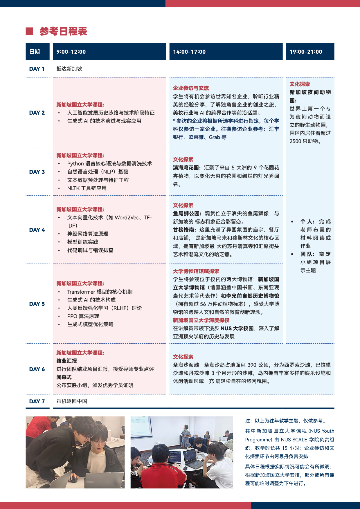 - 不包含:1. 住宿费、每日酒店至学校通勤交通费用、项目接送机费用 * 可选后勤服务方案,包含项目接送机费用 ( 仅限与团队出行或者与团队机票航班时间接近的固定大巴 )、每日酒店至学校通勤交通费用、四星级酒店双人间床位(含早餐),房间数量有限,请及时咨询顾问老师。注:如不选择后勤服务方案,请注意新加坡境内未成年人单独入住酒店需有成年人陪同)2. 国际往返机票(北京或上海或深圳或香港某一个/多个城市集合往返),可以自行购买或者统一购买(购买机票前请务必与阿思丹负责老师确认) 3. 新加坡期间饮食费用(约 15-20 新币每餐)