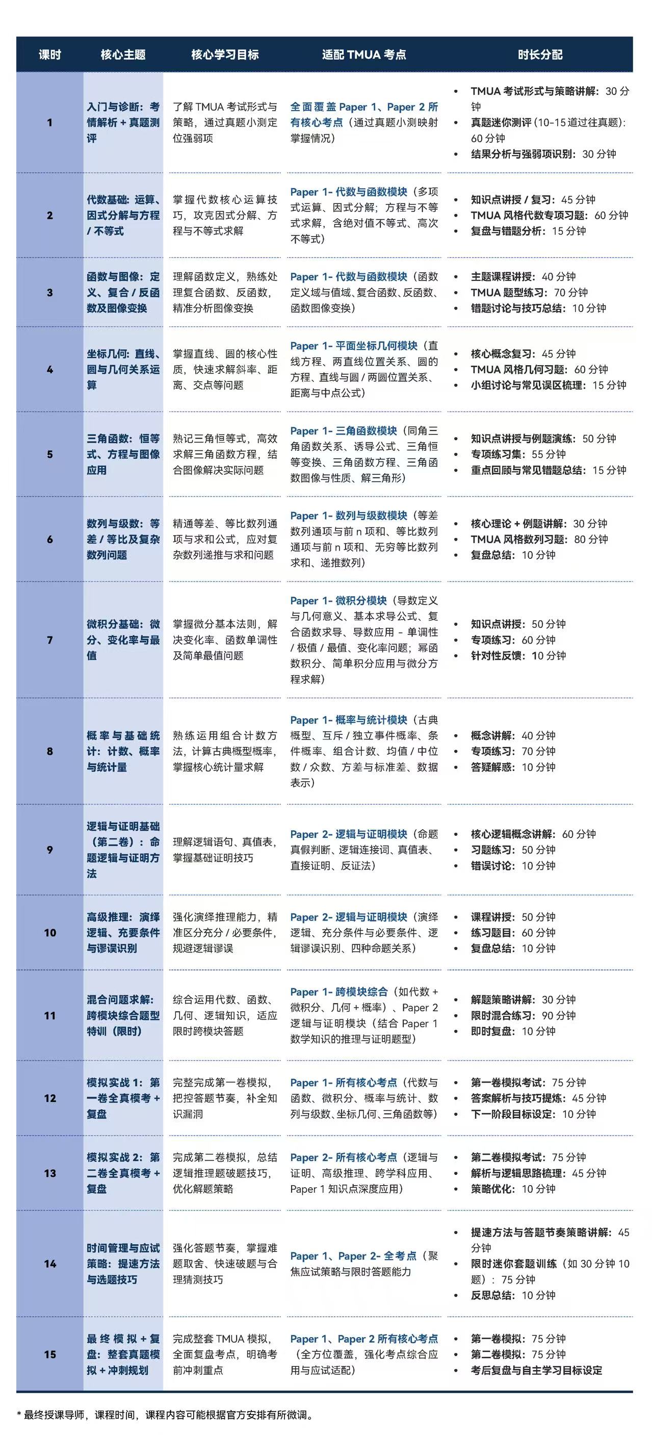 - 掌握适配 TMUA“无计算器 + 选择题” 考试形式的应试技巧、时间管理方法与解题策略。