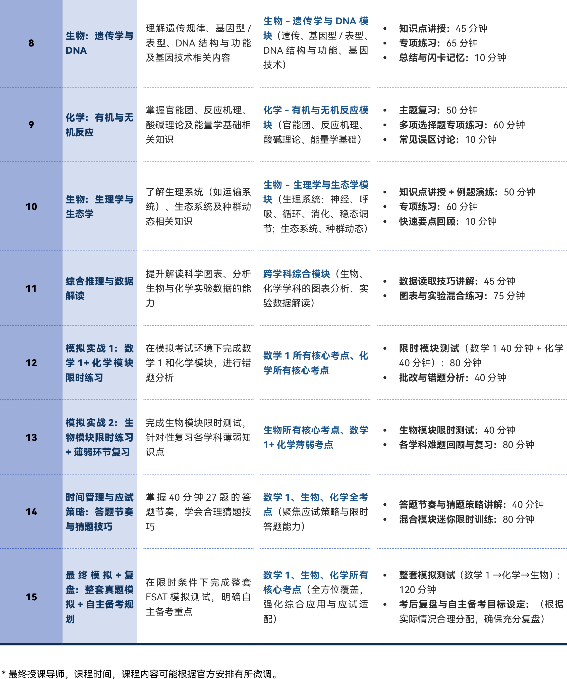 - 精通 ESAT 数学 1(核心数字、代数、几何与统计)、化学(基础原理、化学反应与定量分析、有机 / 无机反应)、生物(细胞生物学、遗传学与 DNA、生理学与生态学)三大科目核心常考知识点;