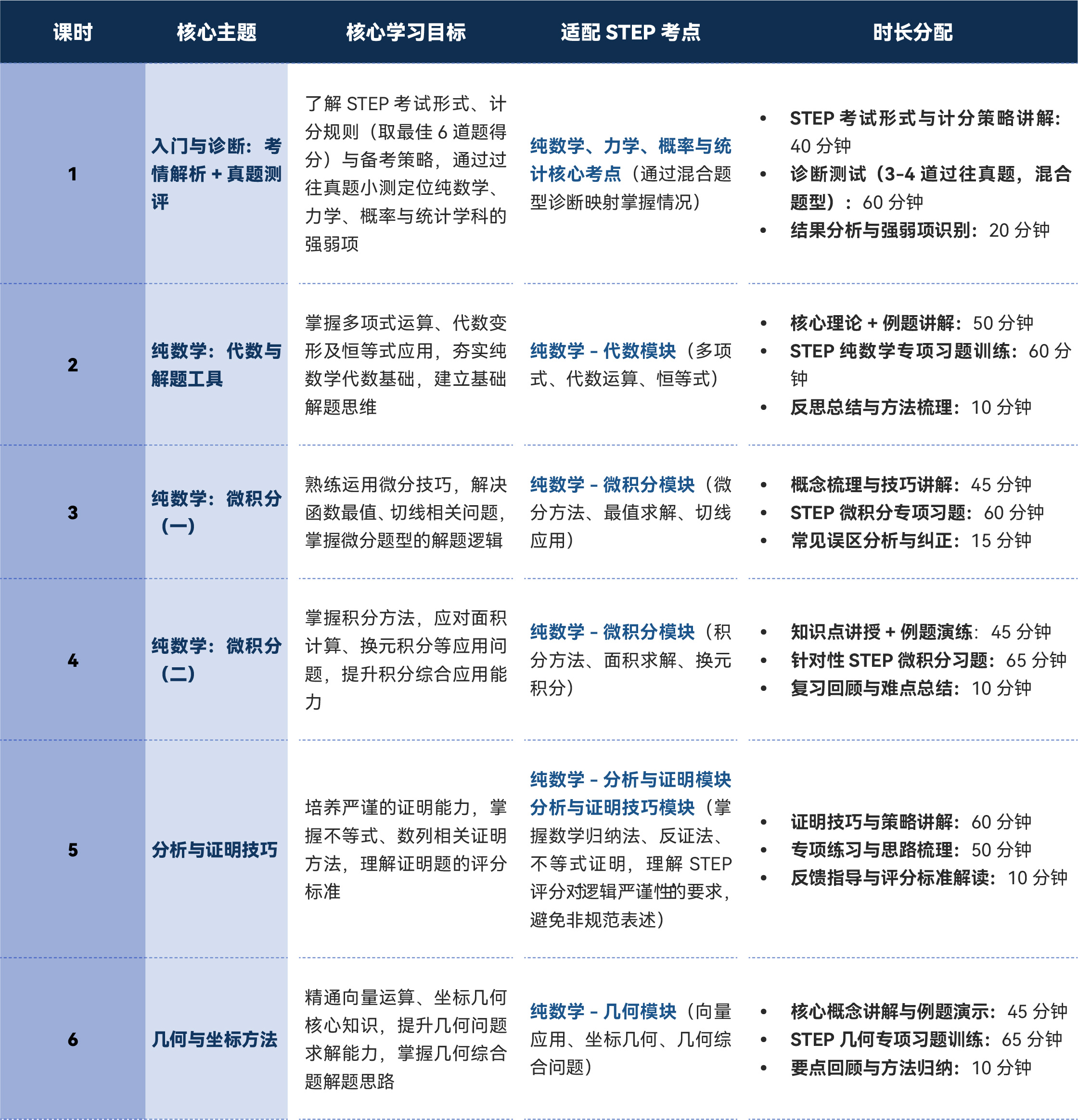- 培养 STEP 考试所需的严谨逻辑推理、创造性解题思维与复杂长难题型突破能力,掌握规范的证明书写与步骤呈现技巧;
