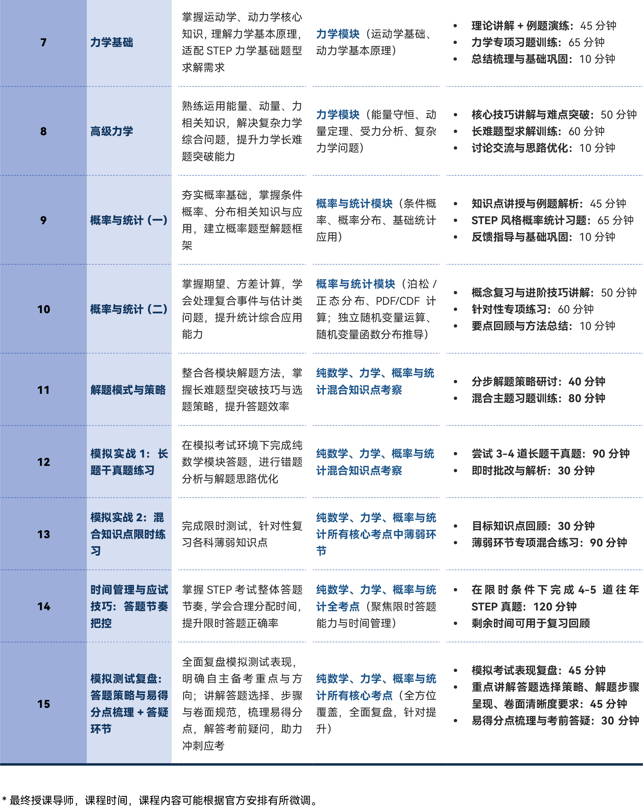 - 精通 STEP 纯数学(代数、微积分、分析与证明、几何)、力学(基础运动学 / 动力学、高级能量与动量应用)、概率与统计(概率分布、期望方差、统计估计)三大模块核心常考知识点与深度应用方法;