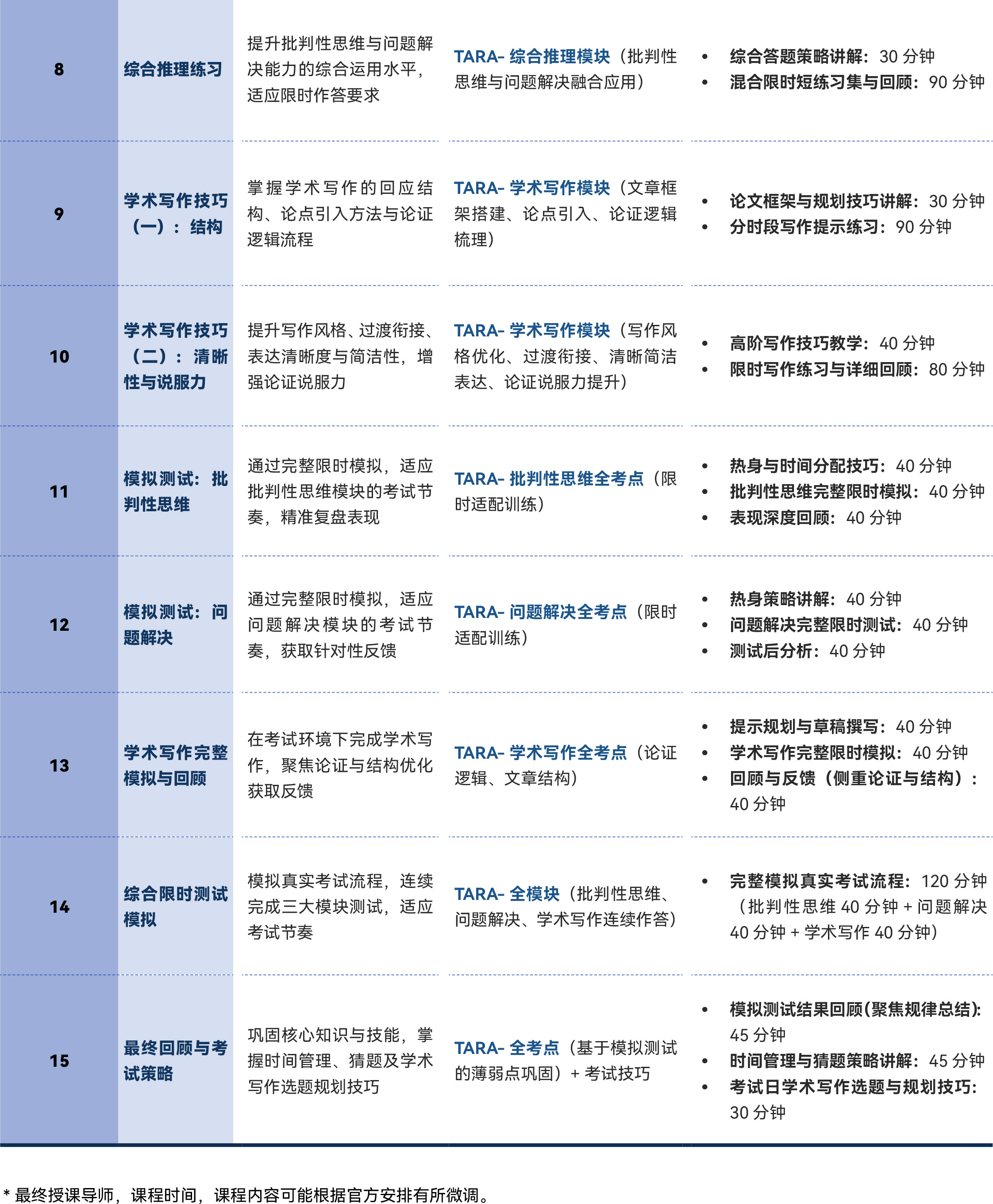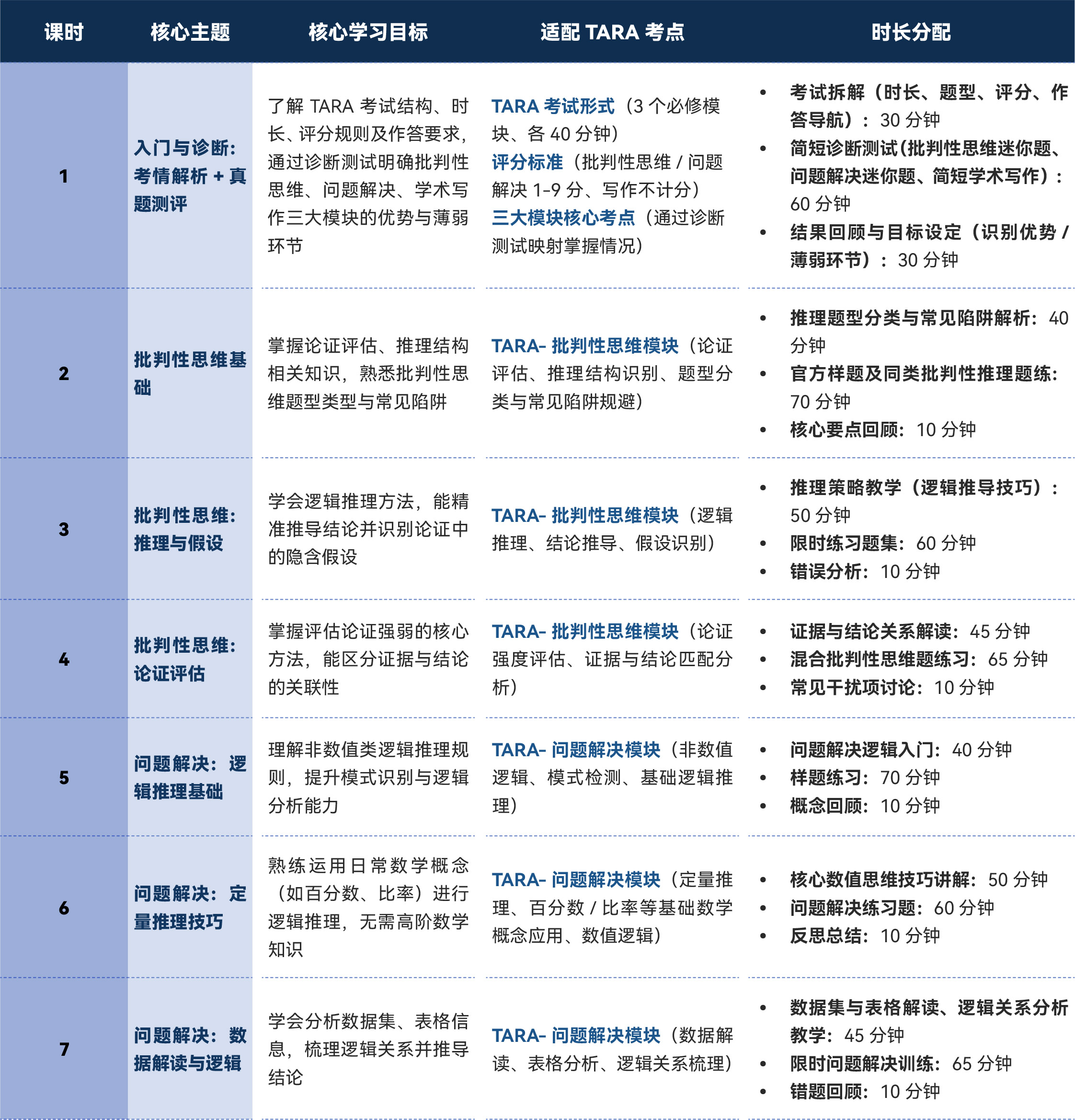 - 培养核心推理能力(论证分析、逻辑推导、数据解读、模式识别)、结构化写作能力( thesis 引入、论证流畅性、简洁表达),以及限时场景下的跨模块能力迁移,适配 TARA 选择题与学术写作的综合考查需求;