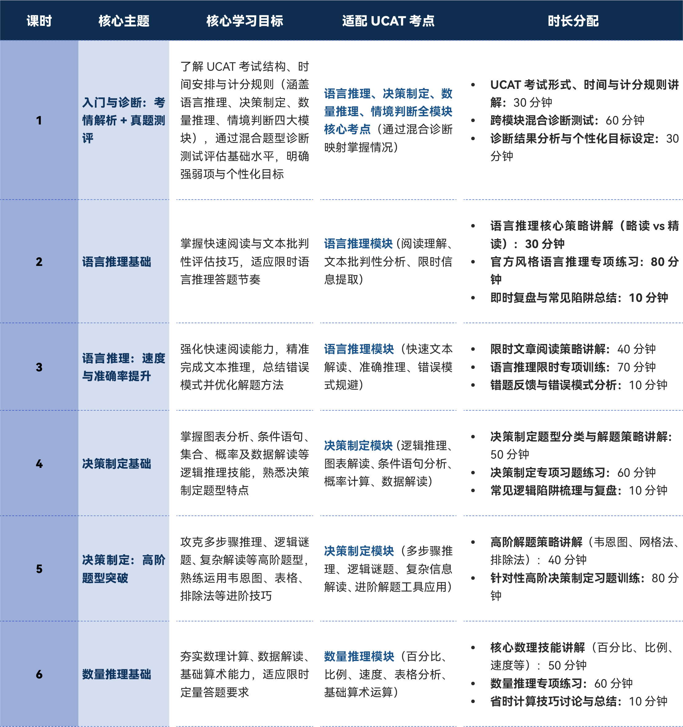 - 精通 UCAT 四大模块(语言推理、决策制定、定量推理、情境判断)核心常考知识点与题型逻辑,包括文本解读、逻辑推理、数理运算、伦理情境应对等关键内容;