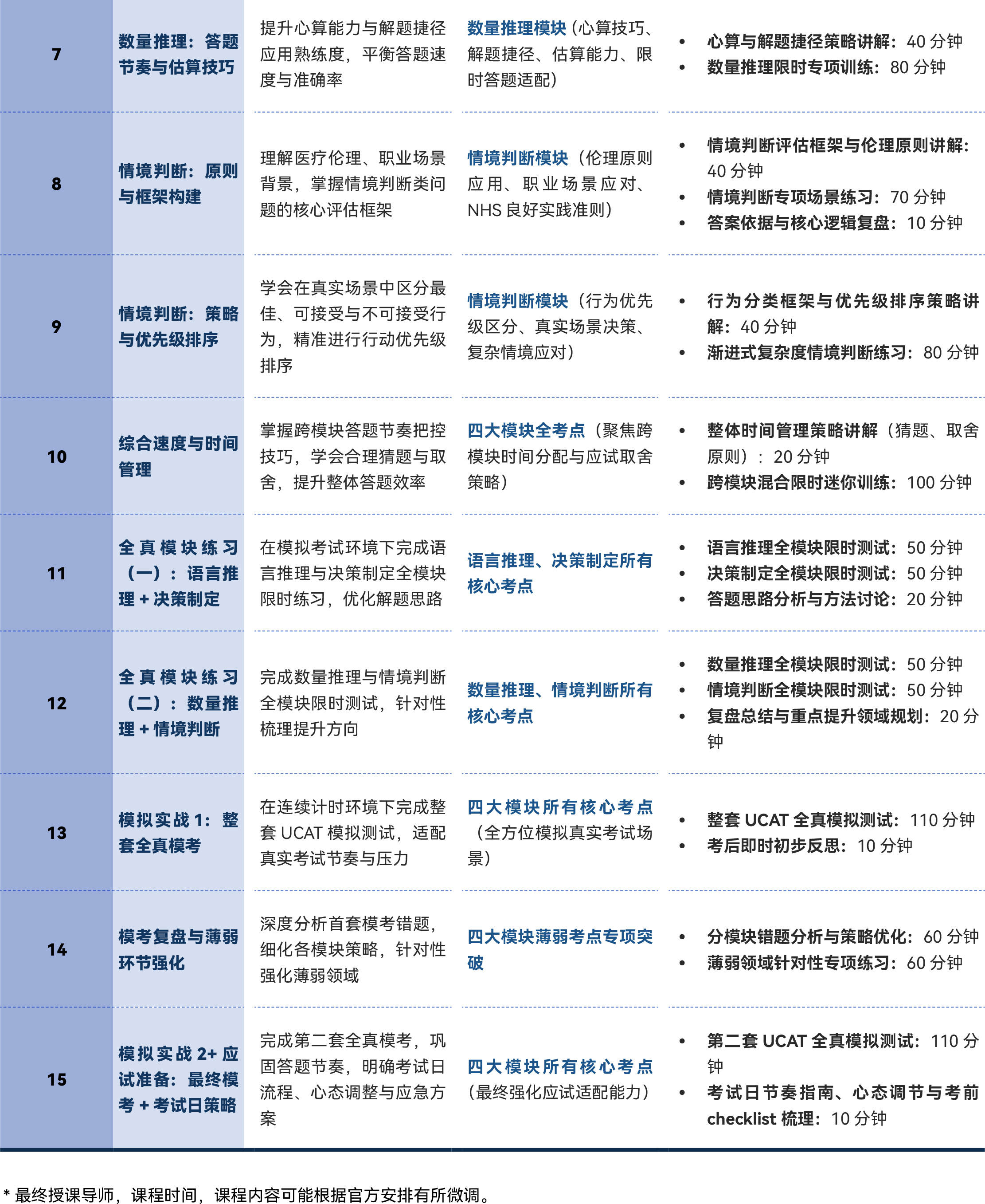 - 掌握适配 UCAT“屏幕计算器(定量 / 决策模块可用+多项选择题 + 多模块连续计时” 考试形式的应试技巧、整体时间分配策略与模块间状态切换方法,提升 2 小时考试的心理耐力与答题效率。